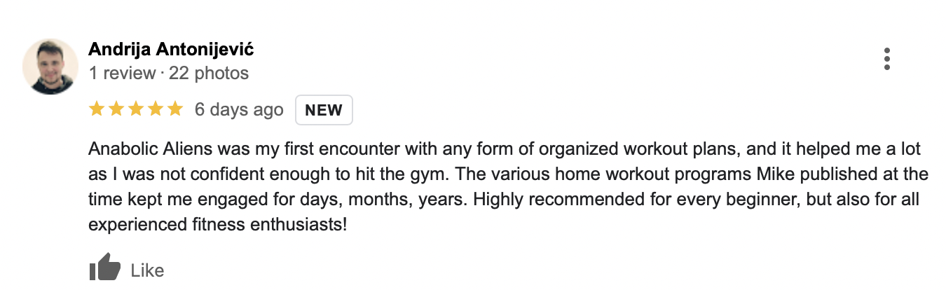 "I've tried a lot of different fitness programs in the past, but the 90 day body transformation program with Anabolic Aliens is truly unique. The workouts are challenging but rewarding, and the community support from Mike and the team is unmatched. If you're looking to transform your body and your life, give Anabolic Aliens a try!"